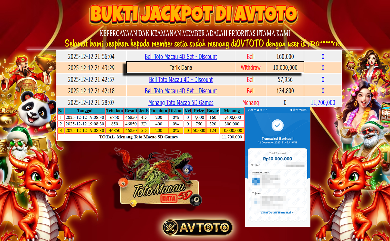 SELAMAT KEPADA USER ID : BA******00 TELAH JACKPOT DI TOGEL TOTOMACAU5D POOLS AVTOTO 11.7 JUTA!!!