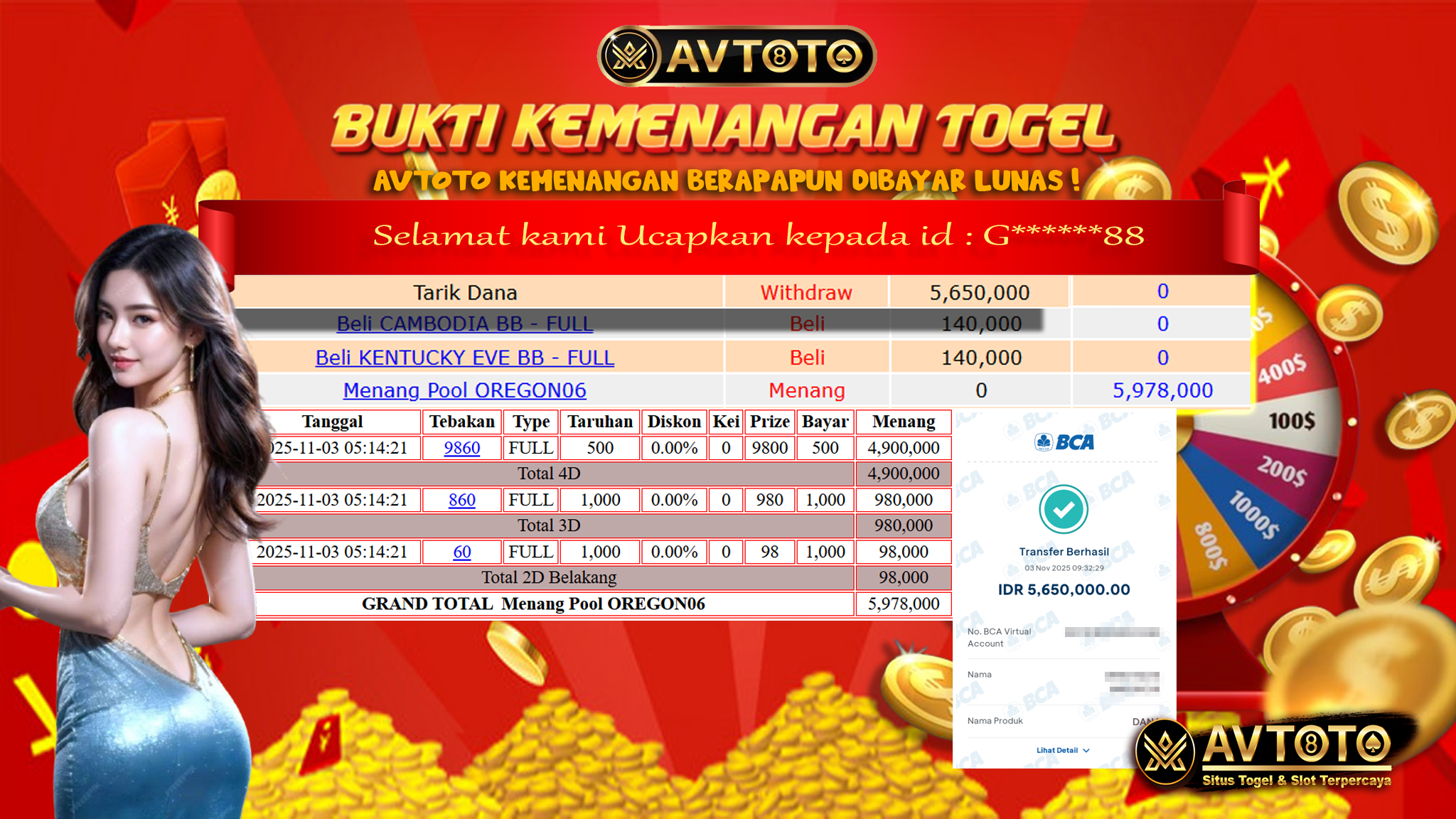 SELAMAT KEPADA USER ID : G****88 TELAH JACKPOT DI TOGEL OREGON POLS AVTOTO 5.9 JUTA!!!
