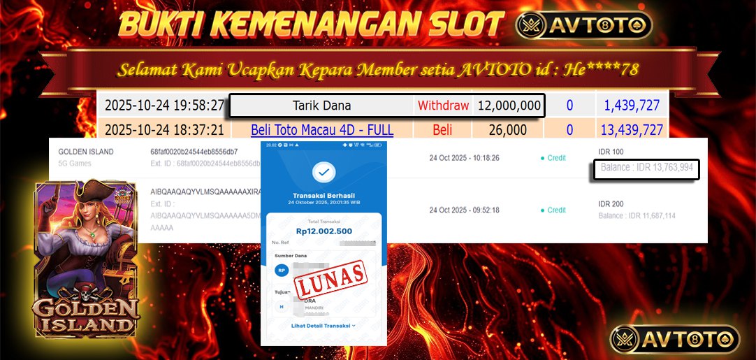 SELAMAT KEPADA USER ID : H*****78 TELAH JACKPOT DI SLOT GOLDEN ISLAND AVTOTO 13 JUTA!!!