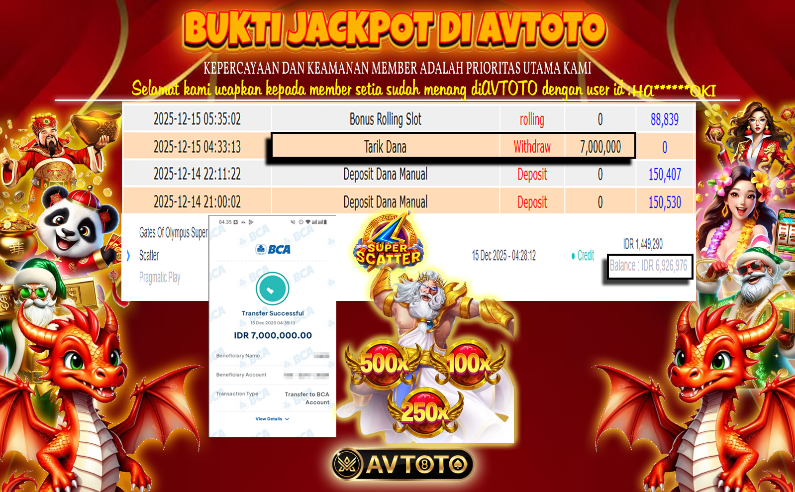 SELAMAT KEPADA USER ID : HA*****OKI TELAH JACKPOT DI GATES OF OLYMPUS SUPER SCATTER AVTOTO 7 JUTA!!