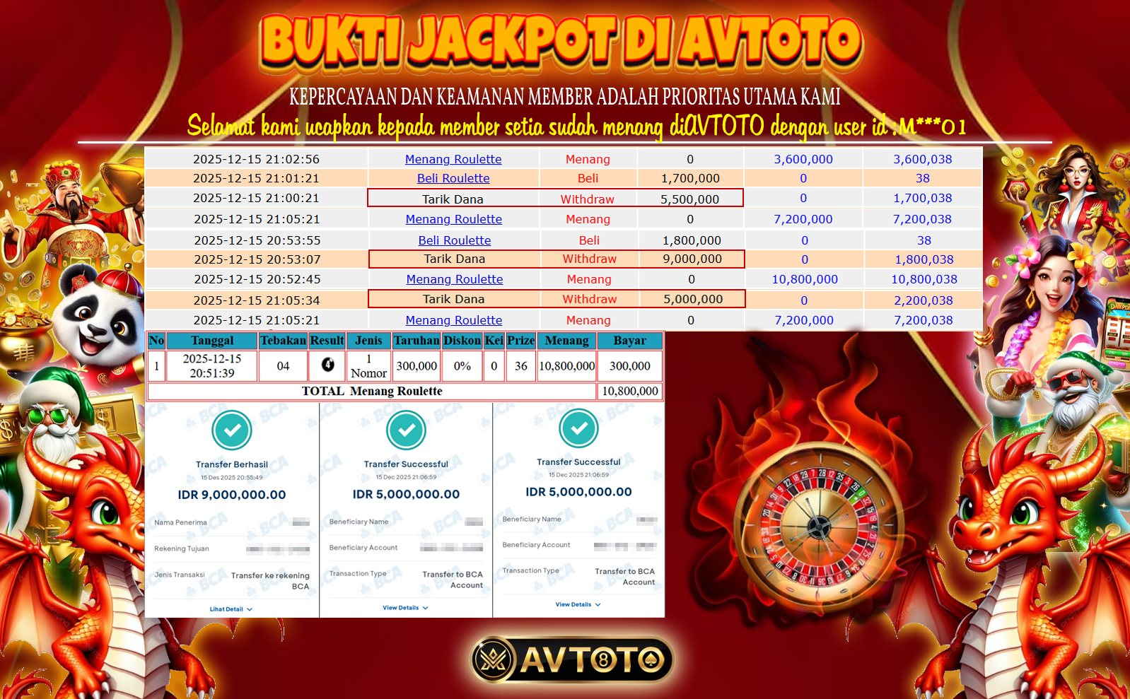 SELAMAT KEPADA USER ID : M****01 TELAH JACKPOT DI ROULLETE GAMES AVTOTO TOTAL KEMENANGAN 20 JUTA!!!